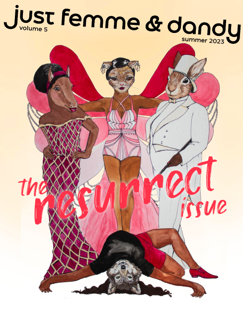 A biannual arts and literary magazine about queer fashion and aesthetics, just femme & dandy was established in 2021 by Co-Editor-in-Chief Addie Tsai, who was emboldened to create the magazine after publishing a folio on queer fashion in 2019 for ANMLY. Centering survival, the fourth issue includes a photo shoot highlighting mobility devices, nonfiction on the liberation of gender-affirming haircuts, and poetry rejoicing in “the altar of Black femininity.” Embracing the importance of queer identity within the context of queer fashion, just femme & dandy works to support the LGBTQIA+ community, “who have long since coded ourselves with how we adorn and dress our bodies when it has been dangerous to identify solely with words.”
