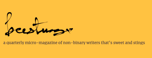 An imprint of Sundress Publications, beestung is a quarterly online “micro-magazine” established in 2019 by Editor-in-Chief Sarah Clark that centers non-binary, genderqueer, and two-spirit writers. Clark is also the Editor-in-Chief and Poetry Editor at ANMLY, the Editor-in-Chief at ALOCASIA, and a Board Member and Assistant Editor at Sundress Publications. Stirring ruminations on androgyny, a writer mourning their late grandparent and uncovering his true gender identity after death, and the personification of unbridled rage encapsulate beestung’s fourteenth issue.