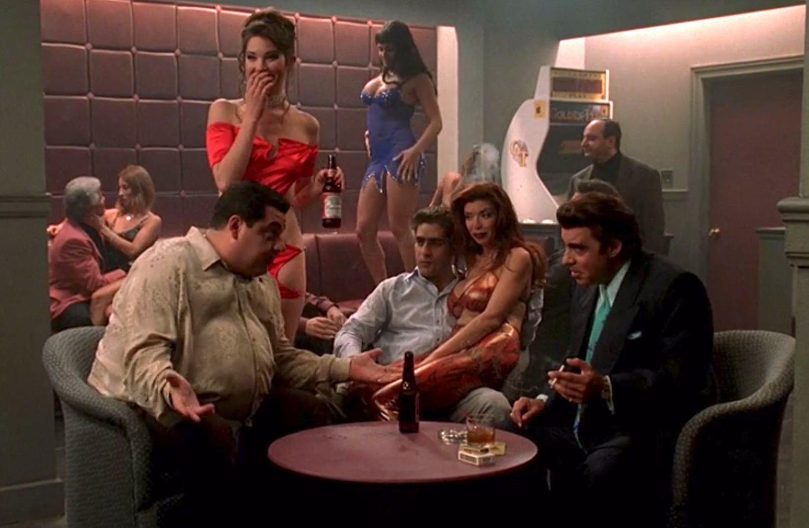 It is midday, and table girls are just getting into the flow of their shift as punters come in, loosening their ties. Or it is 4 a.m., and a lock-in is about to go down; the club owner has to do a quick risk assessment of the people in the room before moving onto shadow hours. Elsewhere, a mob boss drinks at a bar while taking an urgent call from his mother as her house is suddenly aflame—the dancers slow down around him, briefly. Another time, a girl is jostled by a drunken clerk type until one of her companions stands and whispers in the drunk’s ear and he leaves within a flash. We know these scenes as they play out in varying shapes in our own experiences. Some of what I have described is directly harvested from The Sopranos, and some from my last time raving.
