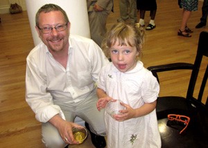 1. Red Lemonade’s Richard Nash, with his daughter Sophia. Note Nash’s styin’ tiger-striped sunglasses on the bench. 2. Kate Travers, who is doing the media for the Bookfest, & Johnny Temple of Akashic Books.