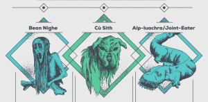 An infographic of creatures from English, Irish, and Scottish folklore, and where you can find them