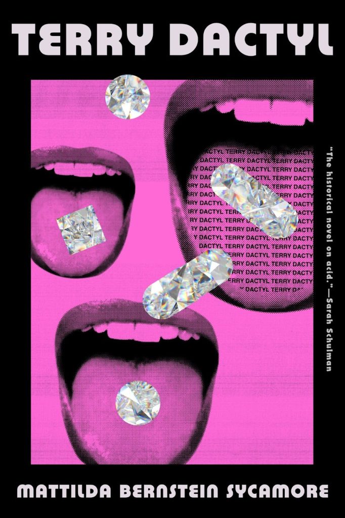 Mattilda Bernstein Sycamore: “Picture yourself late at night on that dance floor in the flashing lights, your head flipping with the beats and, yes, those pills and potions floating right into your mouth opening up to all that experience, honey, you are there in that magenta light, yes, Terry Dactyl starts on the dance floor at the Limelight in New York in 1991 and do you see how this cover does such a great job of conjuring that experience, the way those iridescent three-dimensional pills and potions and papers sparkle in the light of the disco ball maybe they are the disco ball maybe you are the disco ball but also how everything is flattened for the photocopier in your mouth, do you see the title there, TERRY DACTYL TERRY DACTYL TERRY DACTYL TERRY DACTYL and Sarah Schulman’s blurb illuminated out there in the dark on the side, “Historical fiction on acid” because, yes, tear open the gates of literature with your mouth, yes, let’s take another hit of those glittering gems on the cover, that sense of light but also fracturing or fragmenting, mouths open wide, pink tongues hanging out inside that dark frame of night, right, and, yes, it’s true that the book starts on the dance floor at the Limelight, but also it starts in Seattle where Terry grows up with lesbian mothers in the midst of the AIDS crisis, her mothers are party girls so that disco ball those pills those potions are in their living room with all the dancing queens who are Terry’s role models as a trans girl who knows she’s a dyke in a world that doesn’t offer these options but she is ready still with that open mouth, right, open to possibility but actually the present day of the book is 2020, just before COVID lockdown, our mouths hanging open in shock, in trauma, in trying to breathe in spite of it all, and at this point Terry has been working in an art gallery for two decades so you see the art of the cover once again, the creative mess we’re all in. And I love how this cover shows everything at once—the spectacle, the celebration, the excitement of walking into those night lights, the frenetic movement of the book, the floating between and beyond, the shrieking and crying and laughing and flying and dying and living, yes, living, in spite of it all.”