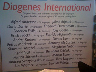 Zurich-based publisher Diogenes owns the rights to a number of international authors, and succeeds in selling them worldwide. Along with names like Patrick Susskind and Patricia Highsmith, they represent one of the best young American novelists, Joey Goebel, whose books have found a home in 15 languages. Their display proudly illustrates how far their authors’ books have travelled, all over the world.