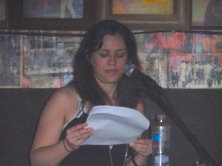 Shelly Oria (who curates the Sweet! Actors Reading Writers series in the East Village, and has a list of publishing credits as long as my arm) read three beguiling shorts. Her take on identity crisis was mediated via “carrying bags of purchased happiness,” and a boyfriend called JoJo who comes home one day as Dora. Our waitress, with long, red hair and Cleopatra bangs, enjoyed the performance; I noticed her laughing to herself as she passed, burdened with a stack of empty pint glasses, which tells you: (1) this is a literary joint; (2) the waitress is intelligent, and cool; (3) the writer is good; (4) the waitress is hot.