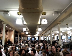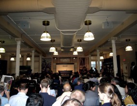This was a hungry crowd of, according to MediaBistro, more than 1,000 people: my accomplice and I arrived an hour early, which secured us seats maybe a hundred feet away from Franzen, too far away to even see his facial expressions. There were security guards, and Franzen had an entourage. There were rules, for godsake. How many literary events hold the possibility of pandemonium and therefore must require rules?