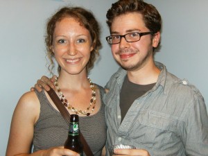 1. A dynamic trio: Allen, Rob, and Erin. 2. Sarah and Kevin enjoyed the free drinks.