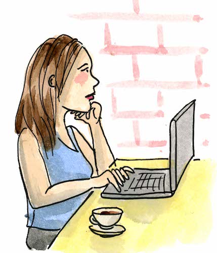 Sit at an indoor table, laptop open in front of you. Stare pensively at the screen as you realize the timeline of your cozy mystery is horribly flawed.