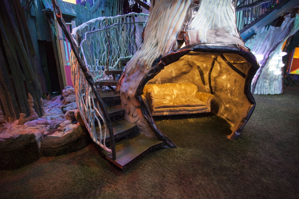You don’t exactly read it, of course—or rather, you don’t read all of it. Dotted around the two-level, 20,000-square-foot space are diaries, blogs, experiment logs, day planners, newspapers, magazines, pamphlets, and notes you can sit down and page through. But there are also treehouses, arcade games, a laser harp, a giant musical light-up mastodon skeleton, and a washing machine you can slide through into a sparkling laundry hole. These, too, are part of the story.