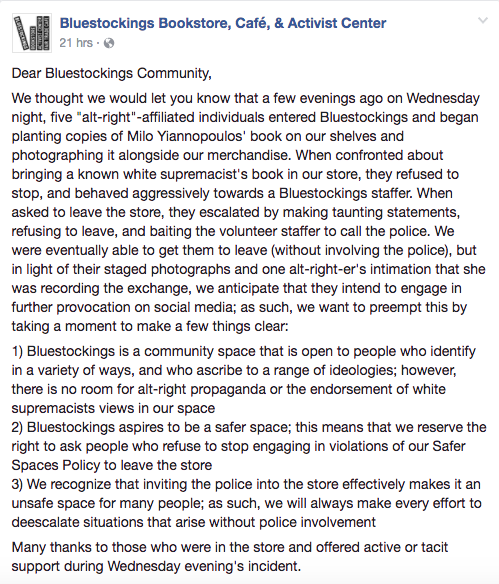 As usual for a group whose main tenet is “everyone’s fucking me over but me,” the intentions of this…protest?…are a little muddy. Were they trying to impugn Bluestockings? To help Yiannopoulos’ real book sales match his fantasy ones? Eh, who literally ever knows. But in any event, Bluestockings’ response, both in the moment and on Facebook, is a model for how businesses and organizations can commit to dealing with people who espouse white supremacy in the name of (their understanding of) free speech.