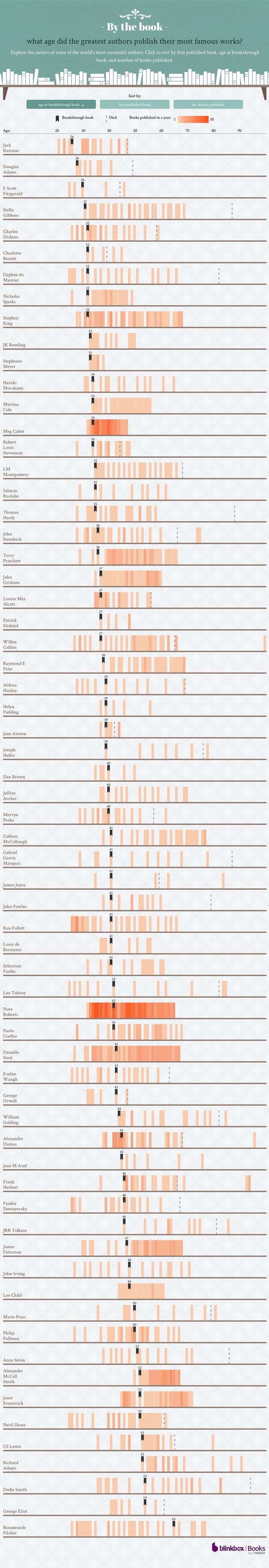 Writers often worry about not publishing earlier enough. Our culture fetishes youth, even in literature. We talk about 5 under 35 and 20 under 40, but not the geniuses flowered later in life. Luckily for us, Blinkbox Books has created this awesome interactive infographic that takes a look at the careers of famous authors. The results show a surprising range for debut novels, from Jack Kerouac at 21 to Richard Adams at 53. The range for breakout books is even wider: 26 to 65 among the authors examined. Click around the infographic, then get back to work on your own novel!