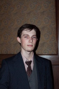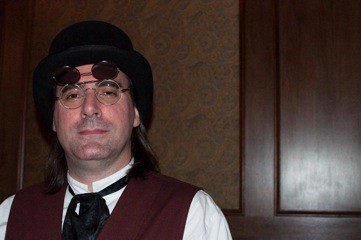 Meetup-member Samuel Sobek, finely dressed in flip-up specs and — I believe that fancy tie’s called — an ascot, explained that he did not take off his hat despite of last night’s unseasonable warmth because, in the nineteenth century, to be without a hat was like walking around with your fly open. (This made me reflexively check to see if I were zipped.) Nathaniel Keats, another member of the steampunk meetup, looked sharp in his pinstripes and tie. Both are excited to read the book, which will be discussed next month in the group’s book club.