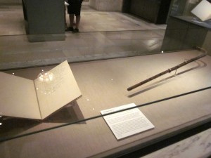 First I came across a case containing Virginia Woolf’s walking stick. The caption explained that her husband, Leonard, had found it floating in the river where she’d drowned herself. Beside it was the entry from her diary, on March 24th, 1941, written four days before her death. It was the last entry she’d ever written and it made me a little weak in the knees, and not only because I had to lean closely to decipher her handwriting. “…had been killed in the war… 3 covered chairs with knitting in her hands… And then there was nothing. … I can’t tackle them (but) enjoy having them…” The jaggy words made me wonder how even her biographers could be sure what she’d written in that final entry. And all the while there was just this cane, hovering there — quite possibly the last thing she touched before death.