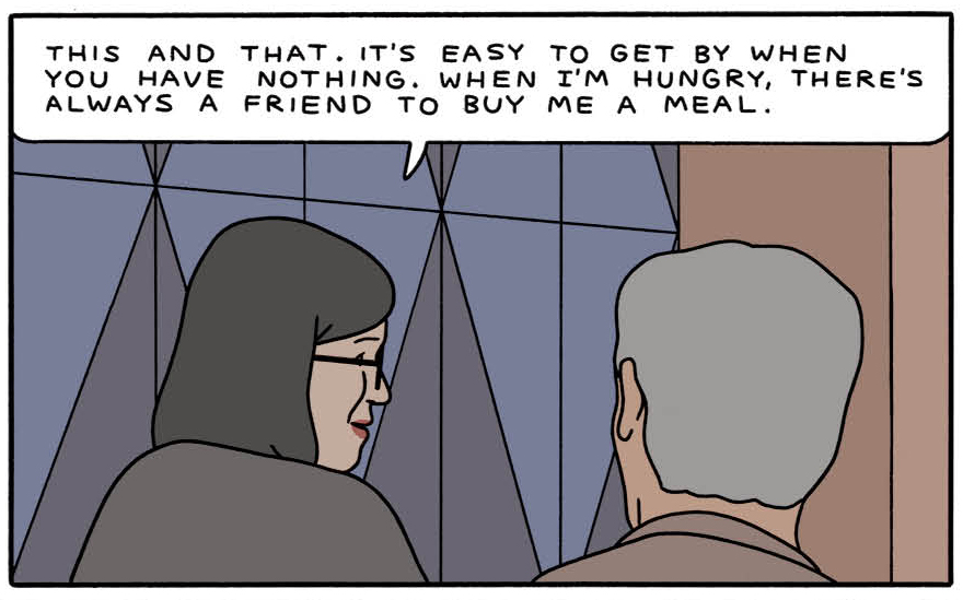 Acting Class is Drnaso’s third book. Less overtly political than Sabrina, Acting Class nonetheless resumes Sabrina’s preoccupation with the unnerving appeal of charlatanism in a nihilistic, alienated age. The ten characters, who enroll in the same evening acting class, are loners adrift in a bleak, colorless world: Drnaso’s drawings exhibit a dull, flat sameness that bespeaks internal landscapes of emotional numbness.