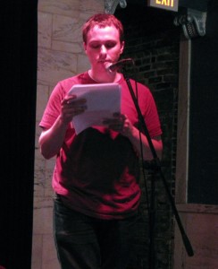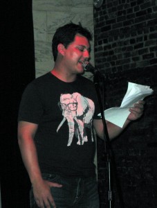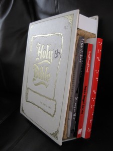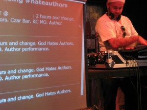 I first met Brandon Tietz and Caleb J. Ross at AWP DC last winter. When I asked for their help setting up something for us in KC, they conjured this unusual GOD HATES AUTHORS showcase at the Czar Bar. The gig would feature literary readings, badbadbad multimedia, spin-doctoring (from DJ Preston Parsons), a live Twitter feed of the event and comedy from emcee Michael Gomez. They planned to raffle off one-of-a-kind prizes, including a disturbing photography book on STDs and “Holyish Bible,” an installation art piece Ross concocted, pairing our novels with a wayward Word of God, thrift-store edition. This was my kind of art-crazy: inclusive, transgressive and not a little blasphemous. You can hear the entire performance, if you like, on this podcast.