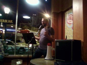The Noir at the Bar release party for an anthology of the same name at Meshuggah Café was a hot time. The venue was packed with darkside lit lovers, many of whom went home not with handfuls but armfuls of books by featured authors Jane Bradley, Scott Phillips, David Cirillo, Phillips’ screenwriting partner and N@Bar co-host Jedidiah Ayres and myself. This was the most passionate book-buying crowd I’d met yet. Profits from the anthology — with contributions by nearly 20 “distasteful” fiction writers, including Kyle Minor, Jonathan Woods and Frank Bill — go directly to local indie retailer Subterranean Books, the only place you can purchase this collection, described in the groovy throwback trailer as “Doom! Lust! Filth and Vile Unpleasantness!” You can read more about N@Bar here and here.