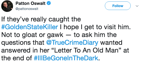 Oswalt tweeted on Wednesday morning that he hoped to visit the suspect, if only to ask the unanswered questions McNamara left behind at the time of her death. McNamara posed some of those questions herself in her direct address to the serial killer, which appears at the end of the book. While there were many things McNamara didn’t know, she was firm on the fact that the Golden State Killer would be found, and the police would show up at his door. “This is how it ends for you,” she wrote.