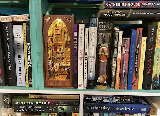 Writer Rebecca Turkewitz’s spooky bookshelf, full of horror novels, gothic fiction, and ghost stories, matches the haunting energy of her short story collection Here in the Night. And we’re obsessed with the miniature bookshop, tucked in the corner, casting a warm glow.