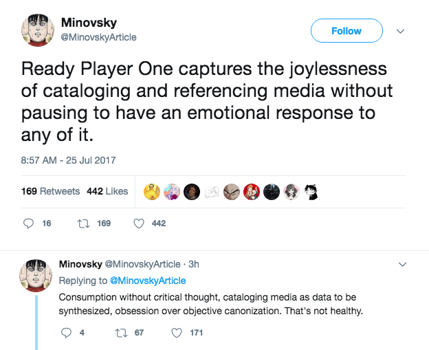 A.V. Club noted that the debate seems to be focused on whether the increasingly mainstream “nerd culture” is a distinct aesthetic or just a collection of pop culture references. Other outlets such as The Ringer and Vogue have criticized the movie’s reliance on nostalgia commodification.