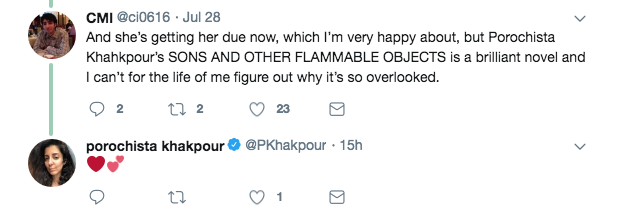 For others like Porochista Khakpour, who is starting to receive more attention for her book, Sick, it was heartening to see praise wrap back around to her earlier work.