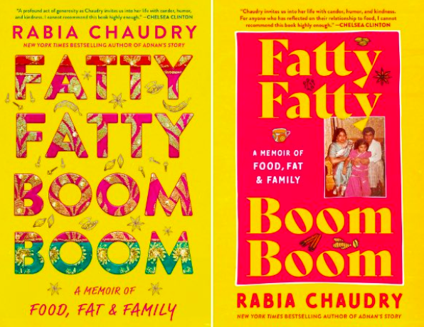 Both covers utilize a pink and yellow color scheme, but the intricate design of the letters on the hardcover edition won over the plainer text and family photo accompanying the paperback cover. Rabia Chaudry’s memoir centers on her evolving relationship with food and body image growing up in a close-knit Pakistani immigrant family.